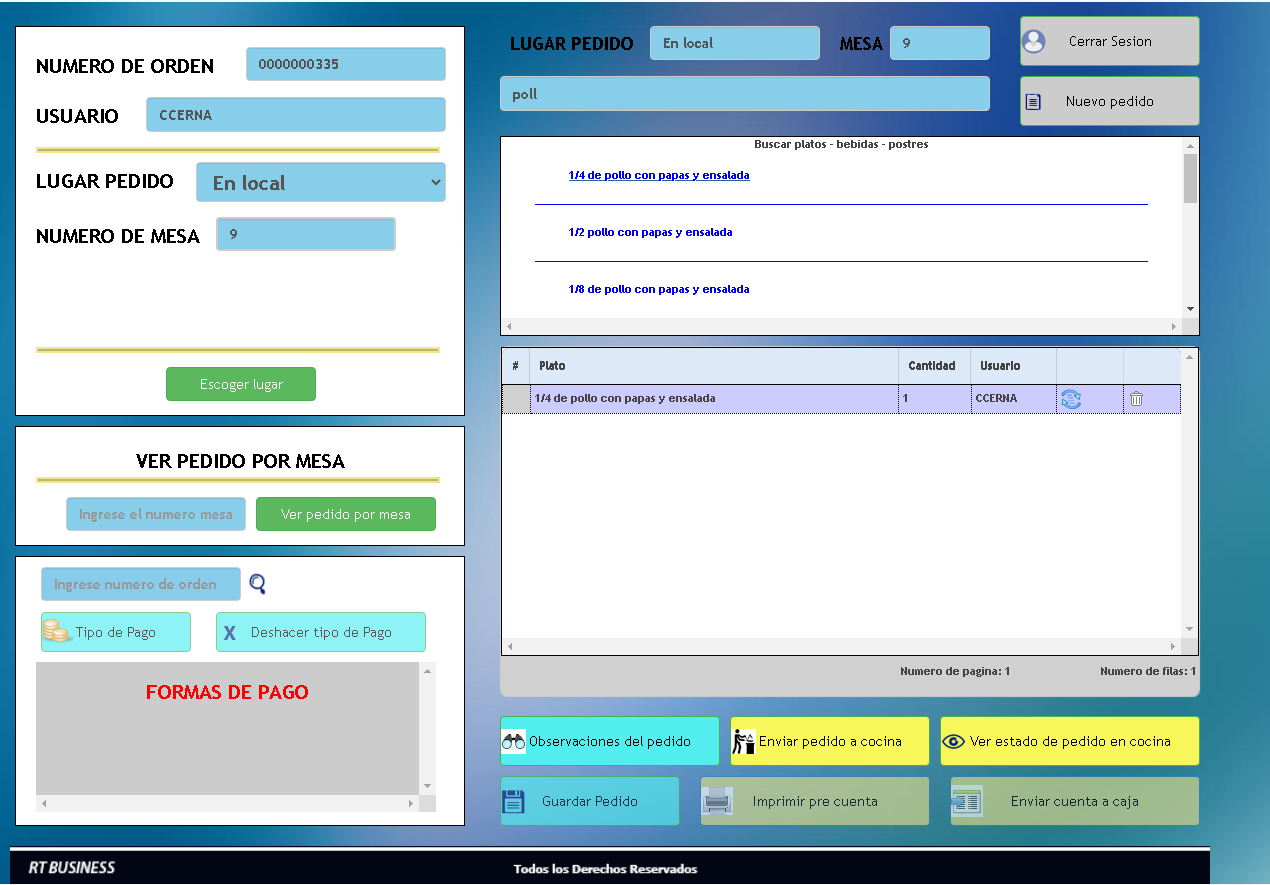 - Modulo para realizar pedidos por parte del mozo, enviar a cocina el pedido, ver el estado de pedido en la cocina, guardar el pedido, generar pre cuenta, seleccionar la forma de pago y enviar el pedido al cajero para que realize el cobro respectivo.