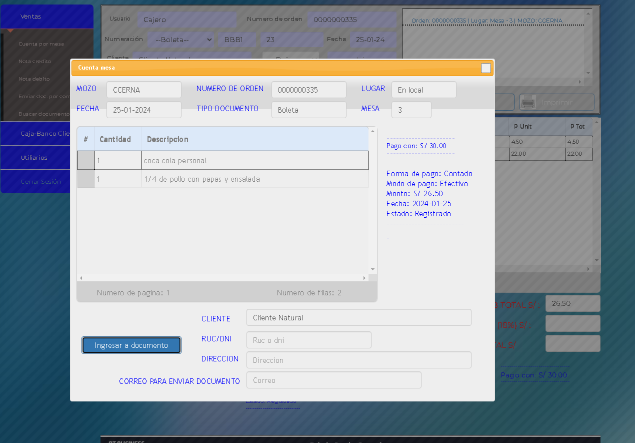 - En cuenta por mesa el cajero recibira el pedido hecho por el mozo con todos los datos para su cobro correspondiente y así poder generar facturas o boletas electronicas para realizar, el cobro, tambié poder generar notas de credito y debitos si fuera necesario, enviar los documentos a los clientes por correo.